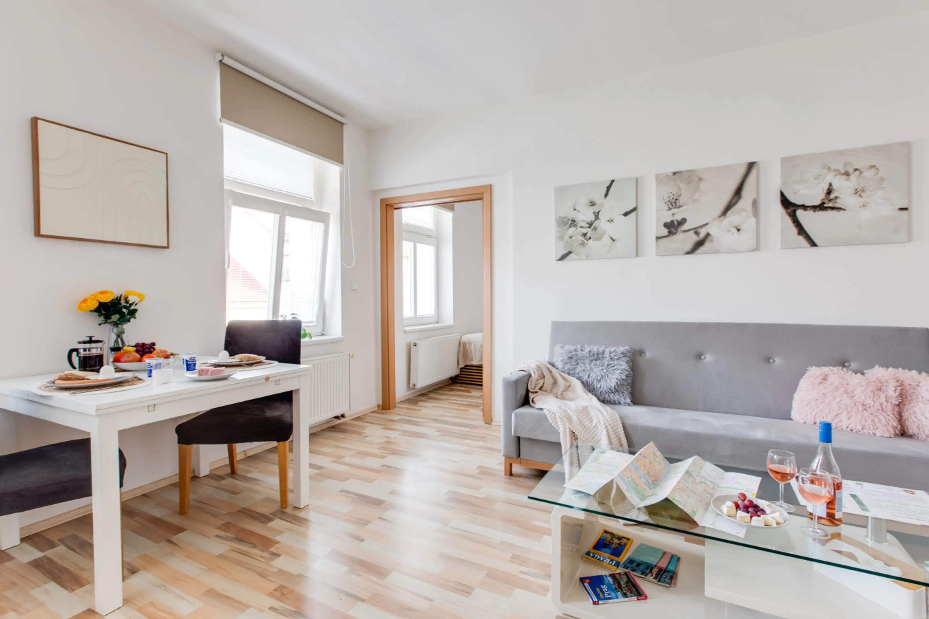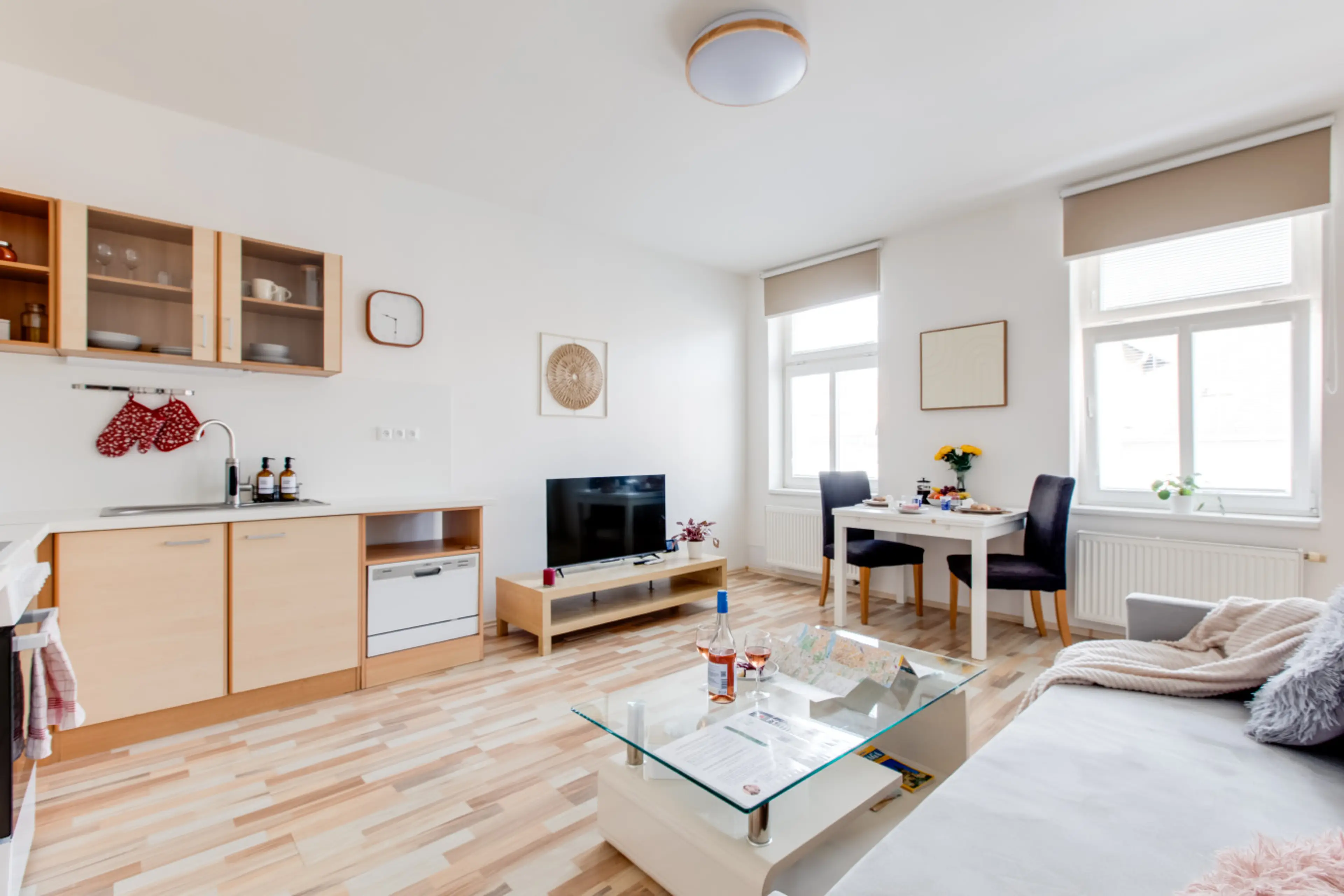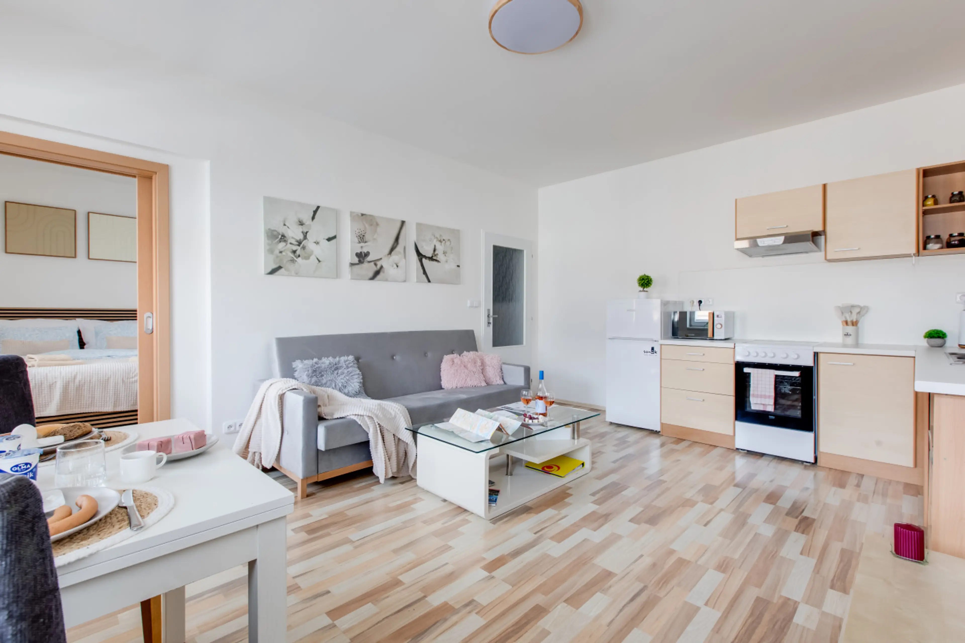 Feel at home in this modern and comfortable apartment — perfect for couples, families, or business travelers who appreciate peace and space. This bright and thoughtfully designed apartment features one cozy bedroom nook and a spacious living area with a fold-out sofa, comfortably hosting up to 3 gu...